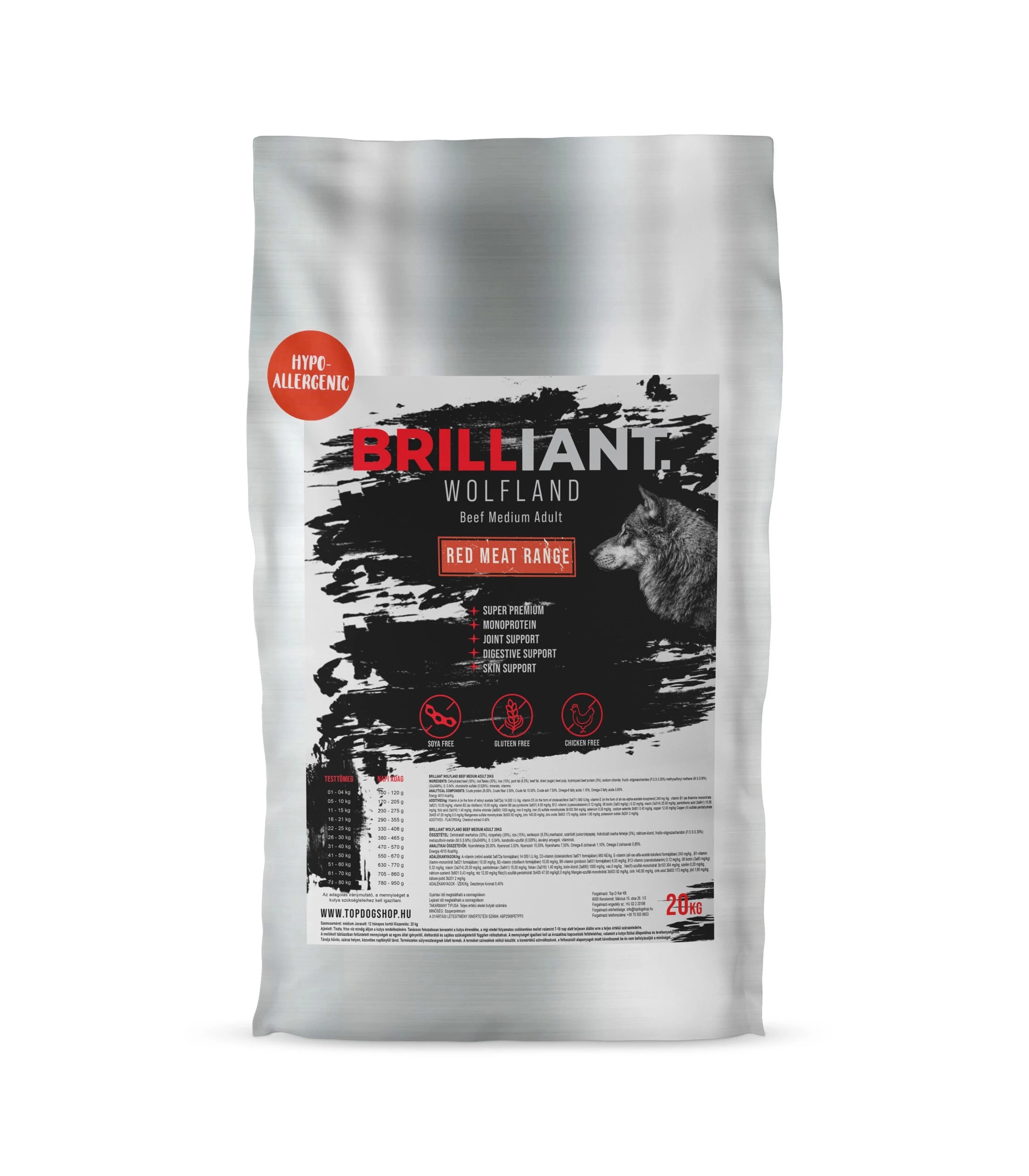 A Brilliant Wolfland Red Meat Range egy monoprotein, gluténmentes, szuperprémium minőségű száraztáp, amelyet kifejezetten közepes és nagytestű felnőtt kutyák számára fejlesztettek. A válogatott, könnyen emészthető marhahús-alapú receptúra támogatja az emésztést, az ízületek egészségét, valamint a máj és a bélflóra megfelelő működését.