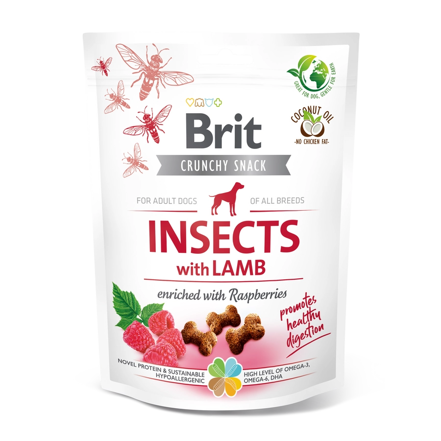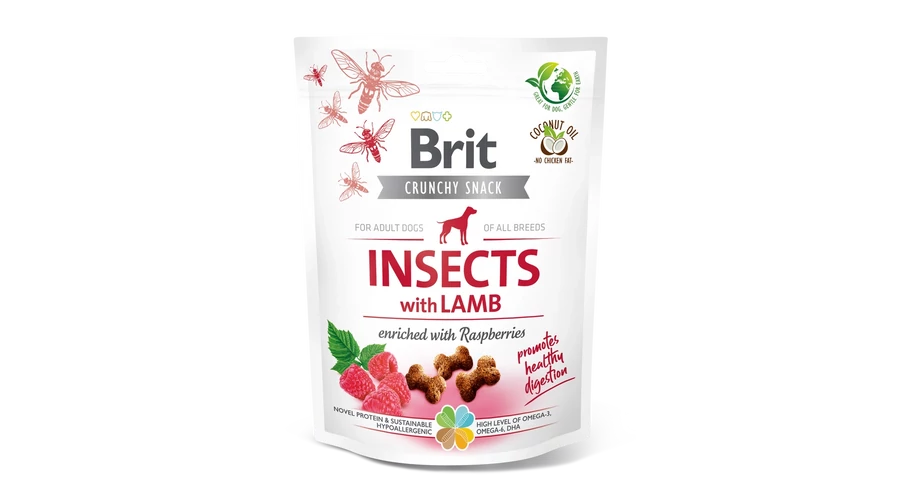 Összetétel: rovarfehérje (26%), borsó, bárányhús fehérje (14%), burgonyakeményítő, kókuszolaj, lenmag (4%), aszalt almabél, hidrolizált csirkemáj, szárított málna (1%), szárított alga (1%, Schizochytrium limacinum), repceolaj.