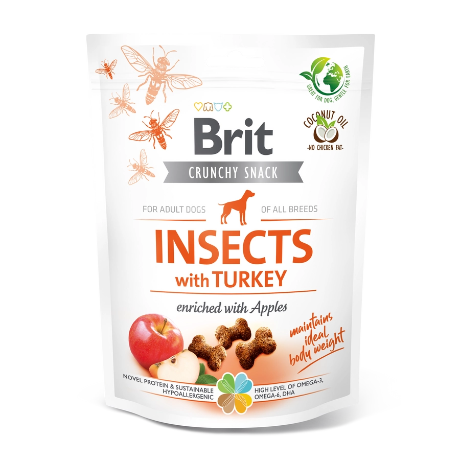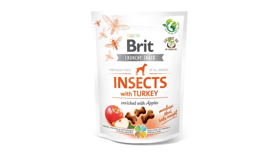 Összetétel: rovarfehérje (26%), borsó, pulykahús fehérje (14%), burgonyakeményítő, kókuszolaj, aszalt almabél (5%), lenmag (4%), hidrolizált csirkemáj, szárított alga (1%, Schizochytrium limacinum), repceolaj.