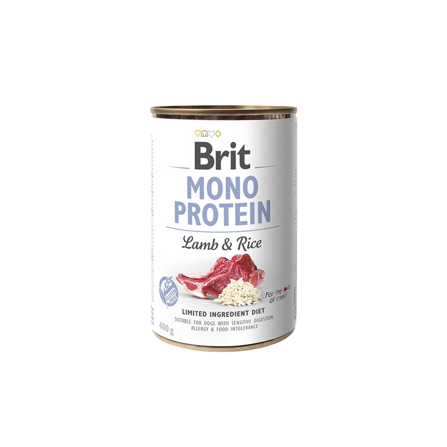 BÁRÁNYBÓL NYERT 100% TISZTA PROTEIN RIZZSEL A Brit Mono Protein komplett és kiegyensúlyozott tápanyagot biztosít. A receptúra csak egyetlen fajta proteint tartalmaz, alkalmas a túlérzékenység és az élelmiszer intolerancia kockázatának csökkentésére. Teljes értékű állateledel felnőtt kutyák számára.