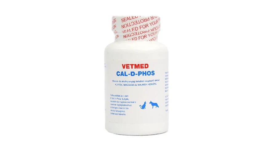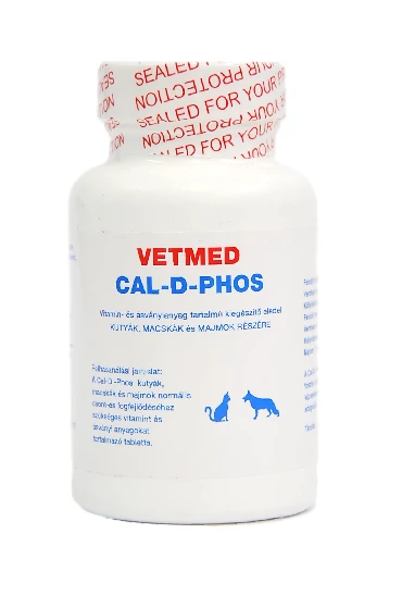 Vetmed Cal-D-Phos – Kutyák, macskák normális csont- és fogfejlődéséhez szükséges anyagokat tartalmazó, közvetlenül szájon át adandó táplálékkiegészítő tabletta.