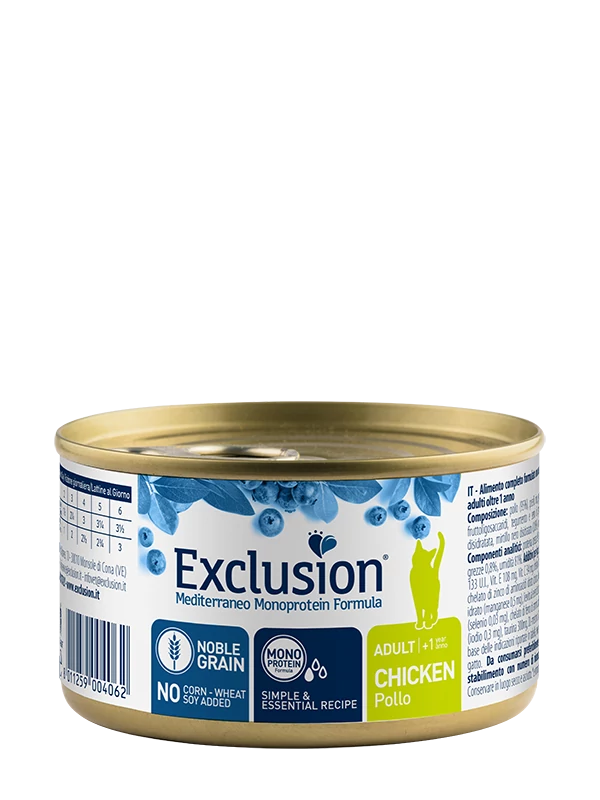 Az Exclusion Mediterraneo Monoprotein Noble Grain Adult Chicken teljes értékű és kiegyensúlyozott száraz macskatáp 1 évesnél idősebb felnőtt macskák számára. A receptúra egyetlen állati fehérjeforrással, csirkével készül, amely jól hasznosuló fehérjét biztosít és segít kielégíteni a macskák természetes táplálkozási igényeit.
