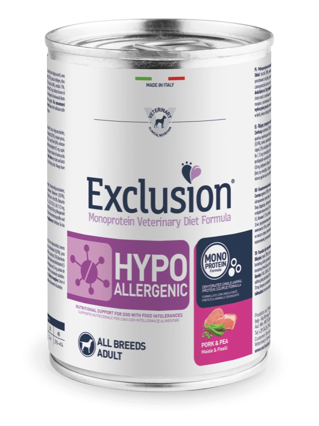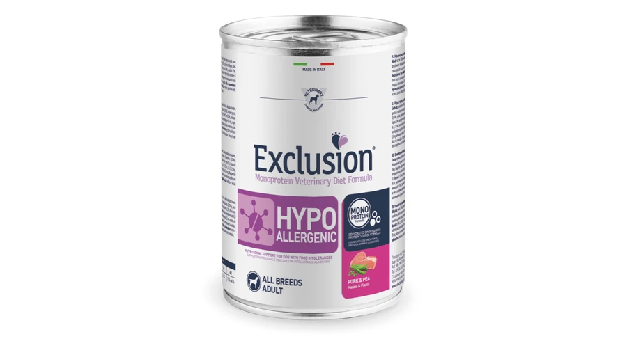 Az Exclusion Diet Hypoallergenic Pork and Pea egy teljesértékű diétás eledel felnőtt kutyák számára, melyet az összetevők és a tápanyag intollerancia csökkentésére fejlesztettek ki. Ez a komplett diétás eledel válogatott forrásból származó fehérjéket és szénhidrátokat tartalmaz.