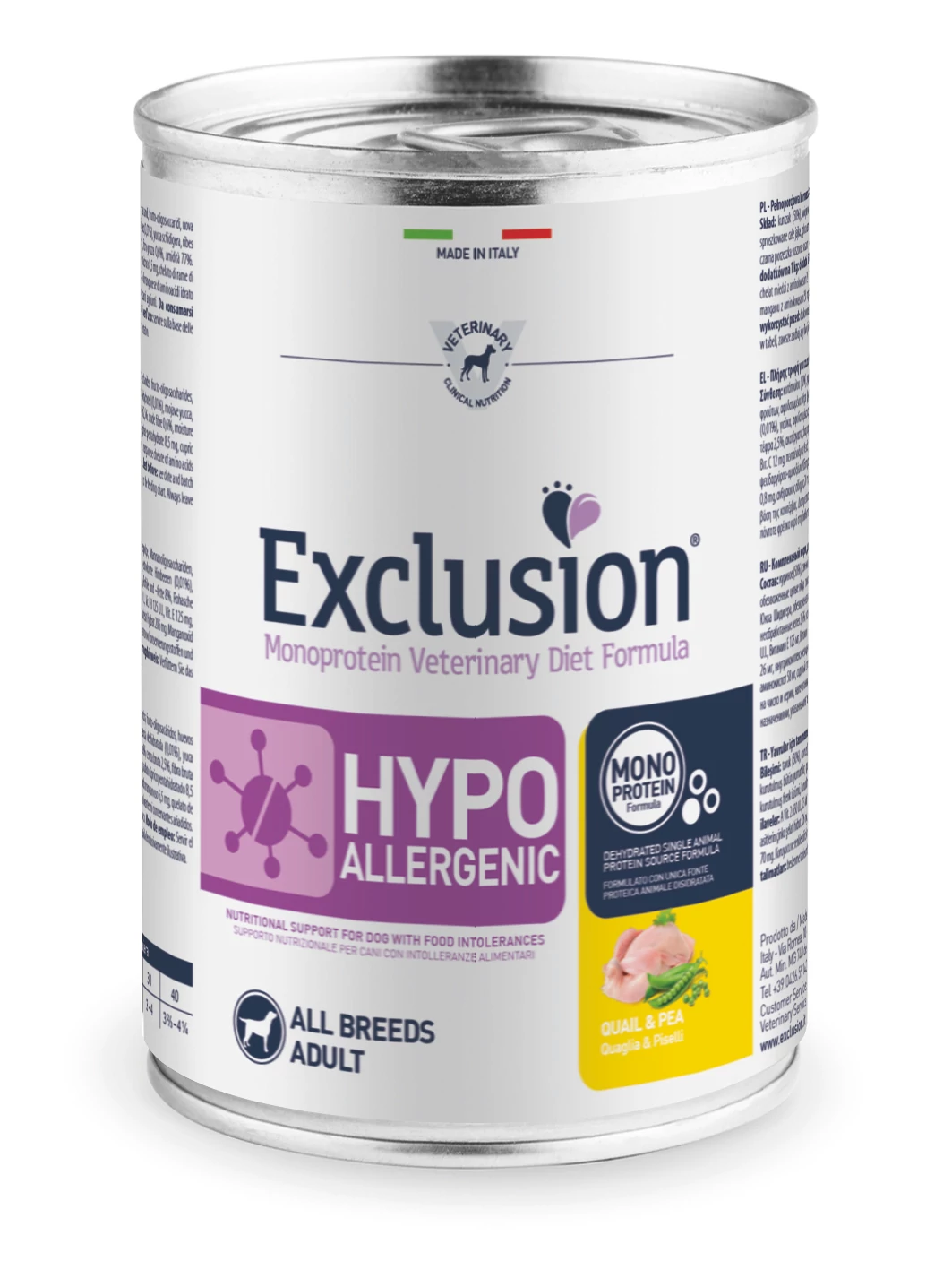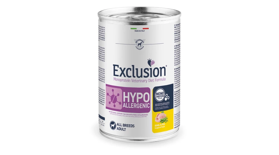 Az Exclusion Diet Hypoallergenic Quail and Pea egy teljesértékű diétás eledel felnőtt kutyák számára, melyet az összetevők és a tápanyag intollerancia csökkentésére fejlesztettek ki. Ez a komplett diétás eledel válogatott forrásból származó fehérjéket és szénhidrátokat tartalmaz.