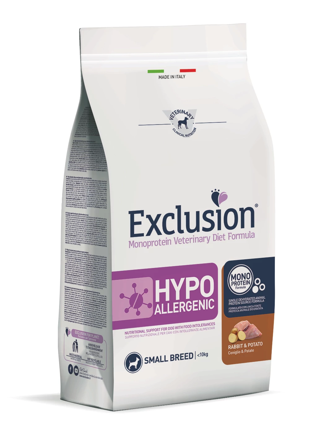 Az Exclusion Diet Hypoallergenic Rabbit and Potato egy teljesértékű diétás eledel felnőtt kutyák számára, melyet az összetevők és a tápanyag intollerancia csökkentésére fejlesztettek ki. Ez a komplett diétás eledel válogatott forrásból származó fehérjéket és szénhidrátokat tartalmaz.
