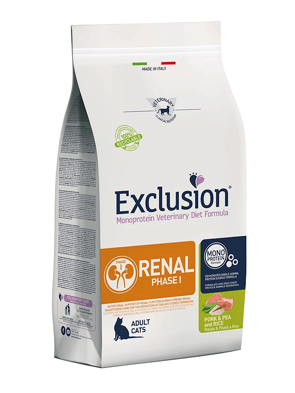 Jellemzői: Az Exclusion Monoprotein Veterinary Diet Formula Renal Phase I egy teljes értékű diétás macskaeledel felnőtt macskák számára, amelyet a vesefunkció támogatására fejlesztettek ki krónikus veseelégtelenség esetén. Ez a diétás macskaeledel csak magas minőségű fehérjéket és alacsony foszforkoncentrációt tartalmaz. Alacsony kalcium- és D-vitamin-tartalma, valamint vizeletlúgosító tulajdonságai révén úgy van összeállítva, hogy csökkentse az oxalátkő-képződést.