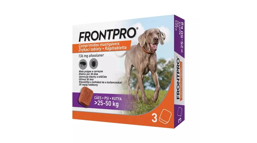 FrontPro Rágótabletta kutyáknak 25-50kg – Újszerű afoxolaner tartalmú, kényelmes és hatékony védekezést kínáló rágótabletta bolha és kullancs fertőzöttség ellen. Használata során nem kerül vegyszer a kutya bőrfelületére, így biztonságosan alkalmazható kisgyermek közelében levő kutyán is. Hatásos rendszeresen kozmetikázott, fürdetett vagy úsztatott kutyák esetében is, mivel hatásidejét sem a víz, sem a samponos fürdetés nem befolyásolja. Szájon át alkalmazandó, ha a kutya nem fogadja el rögtön a tablettát, akkor a táplálékkal is beadható.