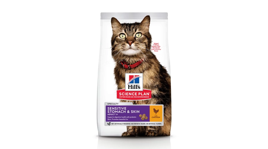 A Hill's Science Plan Adult Sensitive Stomach&Skin száraz macskatáp érzékeny gyomrú és bőrű felnőtt macskáknak Az egészséges bőr és/vagy a kímélő emésztés segítésére tervezve!