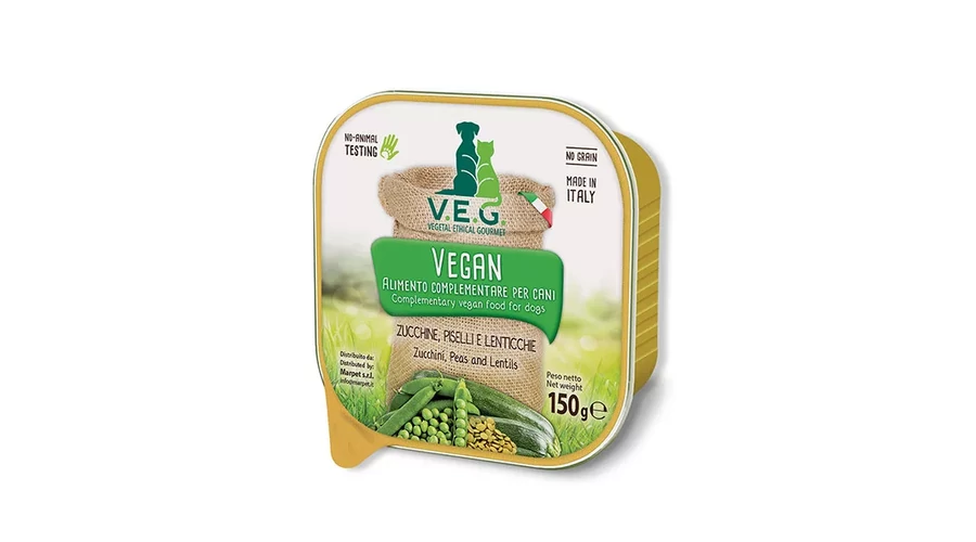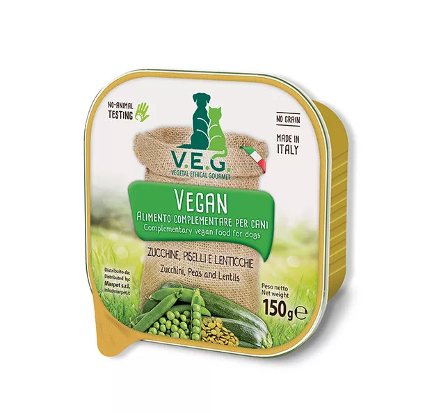 Vegán étrendkiegészítő termék. Cukkini, borsó, lencse - Összetétel: friss gyümölcs és zöldség átalakításának termékei és melléktermékei (cukkini 23%, borsó 23%), lencse (15%).