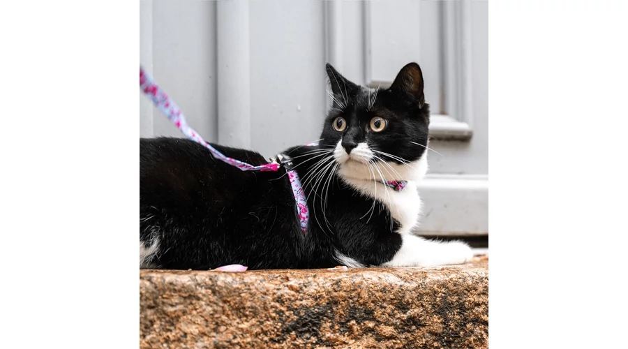 A Max&Molly Cherry Bloom macska póráz és hám szett tökéletes választás azoknak a gazdiknak, akik nemcsak a biztonságot, hanem az egyedi megjelenést is szem előtt tartják. Ez a bájos, cseresznyevirág mintával díszített kiegészítő tavaszi frissességet kölcsönöz kedvencének a közös séták során. A fehér alapszínen pompázó élénk rózsaszín virágok és a hozzá illő, neonrózsaszín csatok azonnal magukra vonzzák a tekintetet.