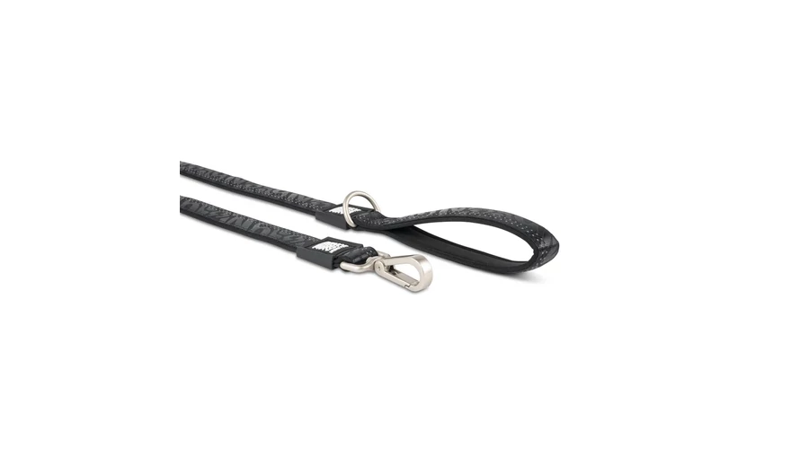 A termék különlegessége a többrétegű anyaghasználatban rejlik. A külső, rendkívül strapabíró poliészter réteget egy belső, puha neoprén bélés egészíti ki, amely nemcsak a kutyának kényelmes, de a gazdi kezét is kíméli, megelőzve a dörzsölést még váratlan rántások esetén is. A fekete szövetet stílusos, apró mintázat és a márkára jellemző elegáns logózás díszíti, ami professzionális hatást kölcsönöz a séták során.