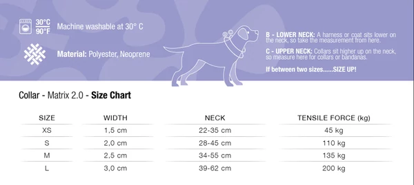 A Matrix 2.0 sorozat tagjai speciális, háromrétegű szendvics konstrukcióval készülnek. A felső réteg strapabíró poliészter, a belső mag extra erőt ad, míg az állattal érintkező alsó rész gyorsan száradó, puha és antiallergén neoprén anyagból készült. Ez a puha bélés megakadályozza a dörzsölést és irritációt, így az érzékeny bőrű kutyák számára is ideális.